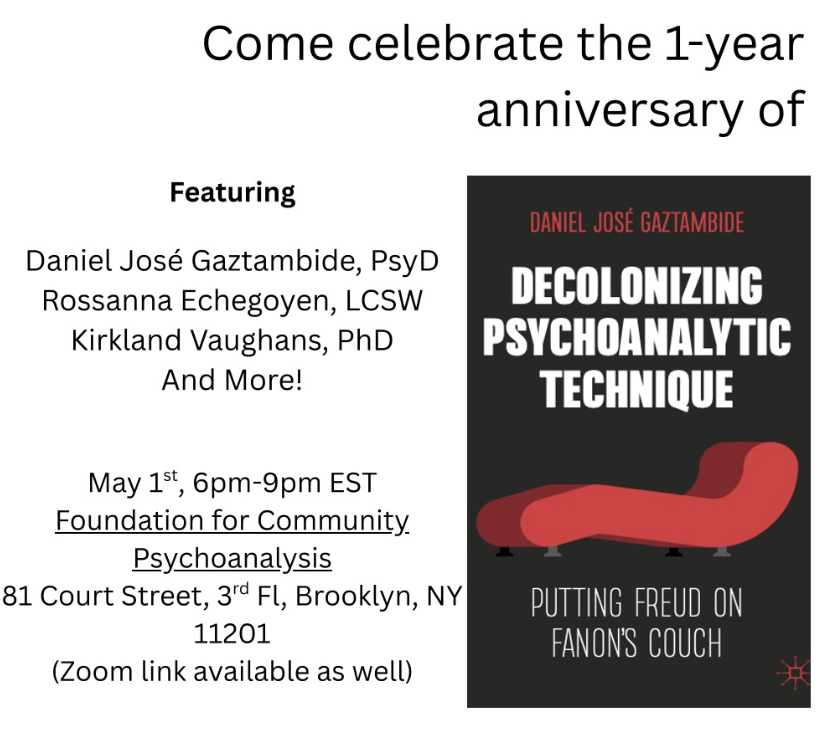 Come join us for the 1-year anniversary of the publication of the book Decolonizing Psychoanalytic Technique: Putting Freud on Fanon’s Couch, winner of a 2024 Gradiva Award for Best Book! The event will take place in-person at the Foundation for Community Psychoanalysis (81 Court St. 3rd Fl) on May 1st @ 6pm. There will be a Zoom option available for those wishing to attend remotely (a link will be sent the day of the event).