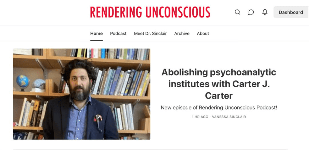 Rendering Unconscious welcomes Carter J. Carter back to the podcast! He’s here to talk about his upcoming event Abolish the Psychoanalytic Institute, part of Psychoanalytic Inquiry’s Decentralized Learning Experiences. Tuesday, May 20th at 5:00 – 6:30 PM PT. Follow them Instagram.